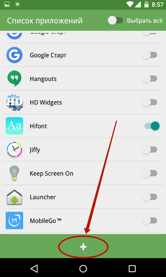 - Откроется окно «Список приложений». Здесь пользователю нужно перевести переключатель напротив каждого приложения, на которое он хочет поставить пароль.