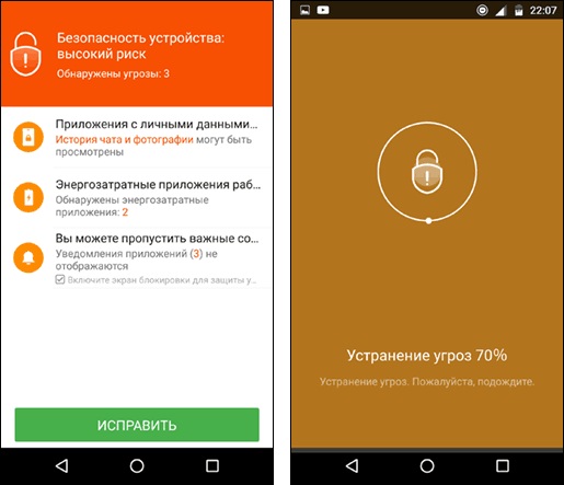 - Во время первого запуска требуется исправить найденные «Угрозы», которые имеются на данном устройстве. Всё бы ничего, но некоторая часть этих «Угроз» — это настройки пользователя, которые затронули работу системы и программ в частности. Пропустить данный шаг нельзя.